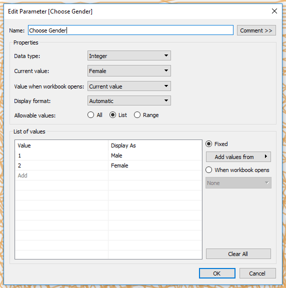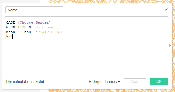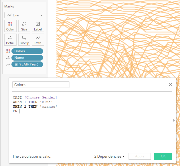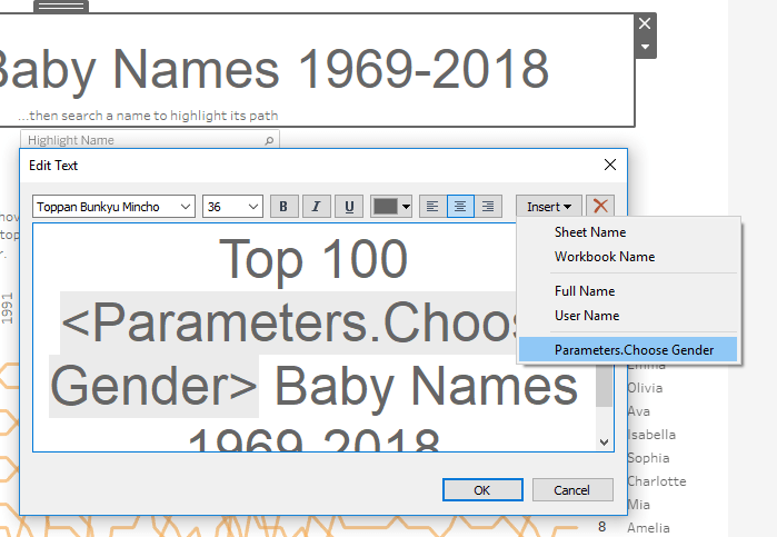 At first I had created two different sheets, one for female name and one for male name. I was thinking I would publish a workbook with two different sheets, one for each female and male, but wanted instead for the user to view it all without having to click to a second tab. I don’t remember how/when I first learned about parameters, but this proved to be a good use case for a very simple parameter: