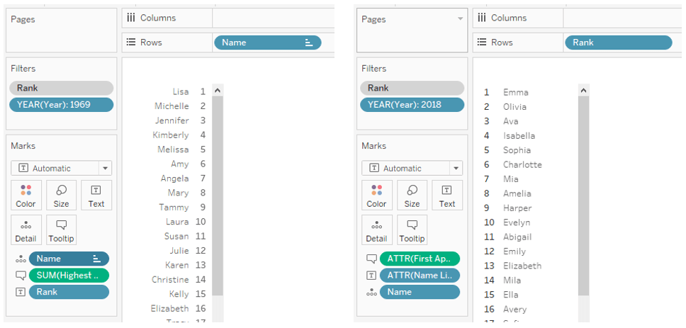 Now that the bump chart was ready, I needed to put the name and rank down each side, one for the top 100 names in 1969 (my starting year) and one for 2018 (the last available year). I wanted symmetry with the numbers closest to the lines, so I created one sheet with name on rows, and one with rank on rows, swapping the dimensions on text.