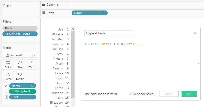 I got stumped at first since adding the dimension “rank” simply returned the rank in the mark. (I had filtered to the year 1969 for this worksheet.) This led me down the path of LODs, which eventually led to my first brush with Tableau order of operations.