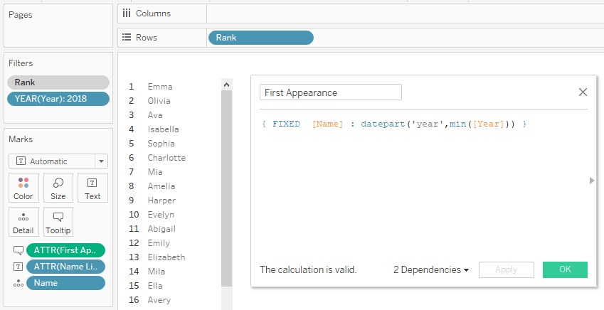 Similarly, for the 2018 list, I created a FIXED LOD to display the year of first appearance:
