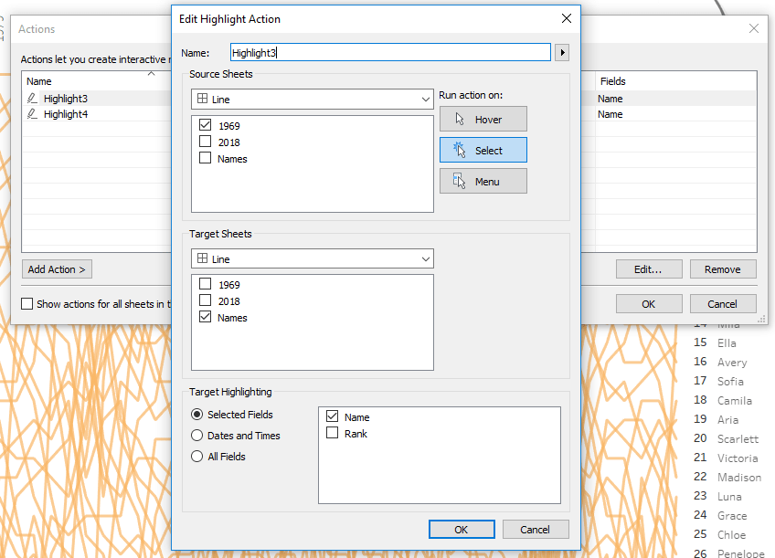 The last major thing to do was to add highlight actions for the dashboard so that clicking on a name in the 1969 or 2018 list would highlight the entire path to show the popularity of the name over the years. (Which was pretty much the goal from the beginning.)