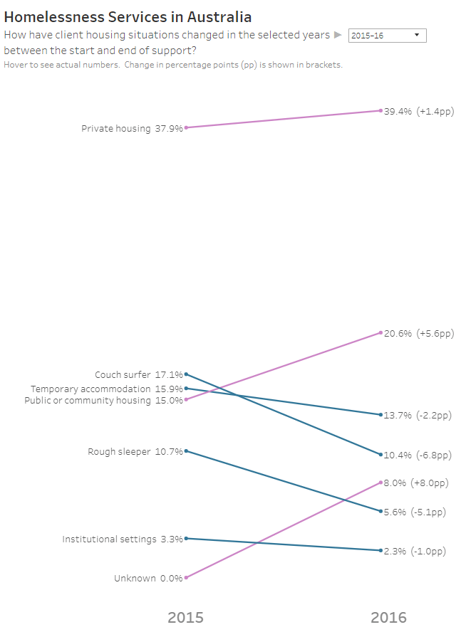 To recap, slope charts can be a good choice when you want to compare two values of a measure between two members of a dimension or two points in time. When slope charts are too clustered to make them readable, there are a number of ways to present the view:
