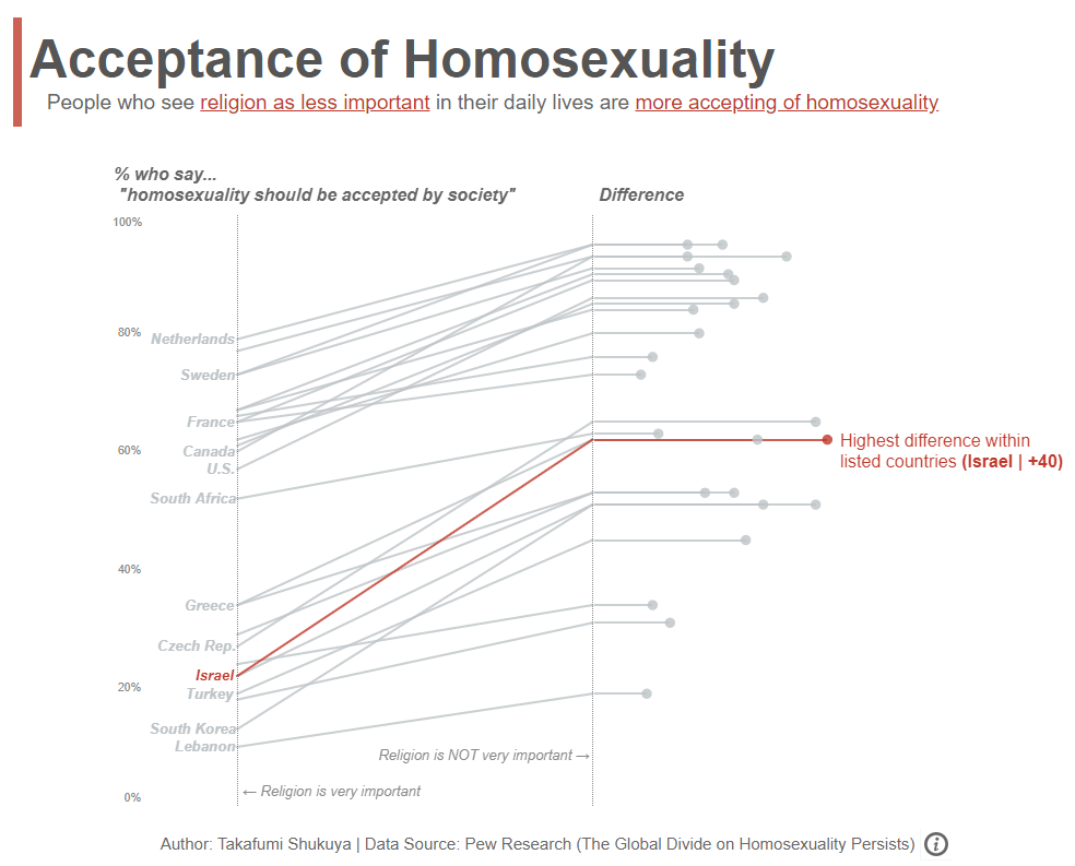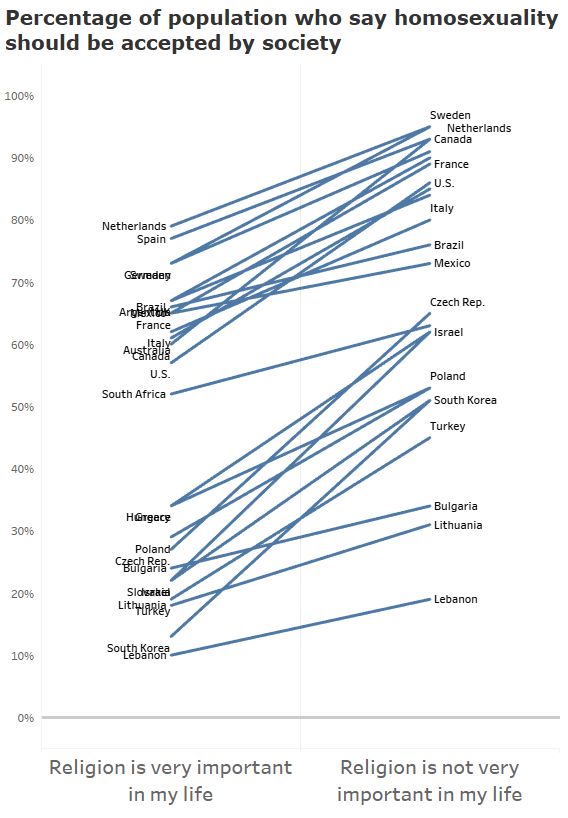 The purpose was to compare the views of religious and non-religious people on whether homosexuality should be accepted by society. While this is not the only way to display this information, the slope graph lets us quickly see that in the 25 countries included, the non-religious tend to agree more that homosexuality should be accepted. We can also quickly see that for some countries, the difference in views between the religious and non-religious are larger (ie, a steeper slope).