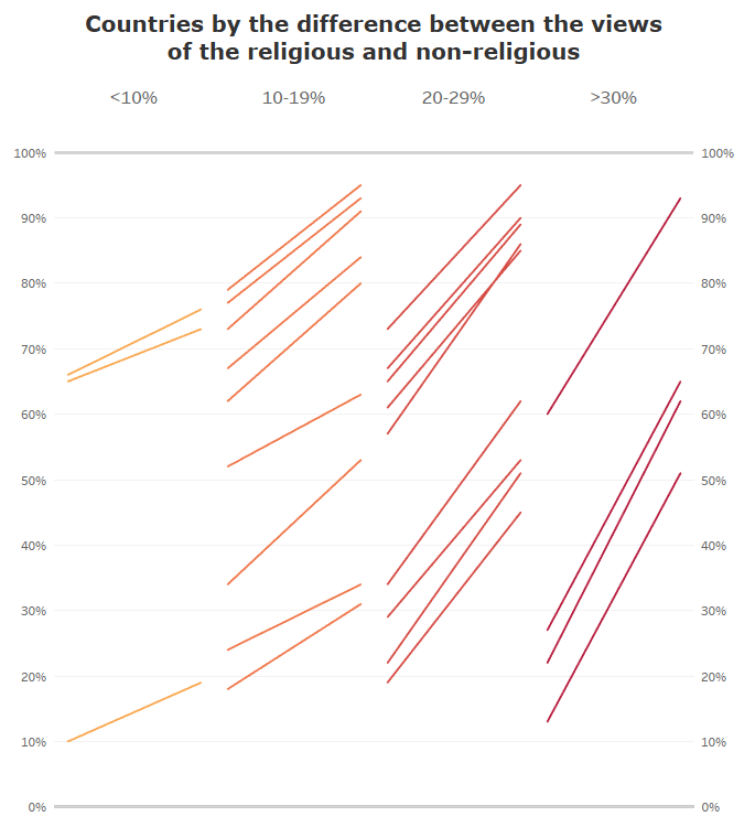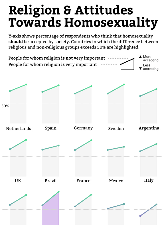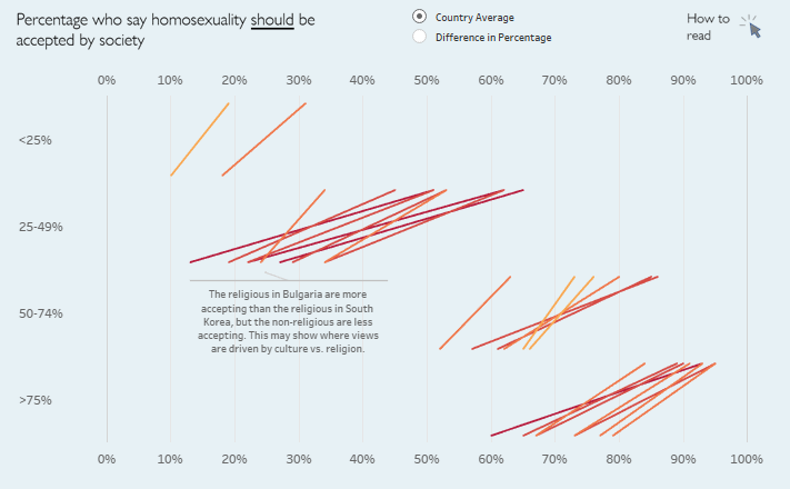 Because all lines are compared on the same y-axis, it is easier to gain insights about this selected dimension. Comparing North America with Central and South America we see that the religious in North America are less accepting of homosexuality, but the non-religious are more accepting. There is a bigger divide in North America between the religious and non-religious.