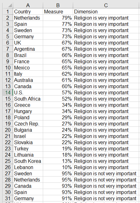 The first step is to arrange your data. You will need to pivot your data if the members of slope-chart dimension are originally in separate columns. (In this case, “Religion is very important” and “Religion is not very important” were in separate columns originally.)