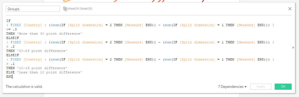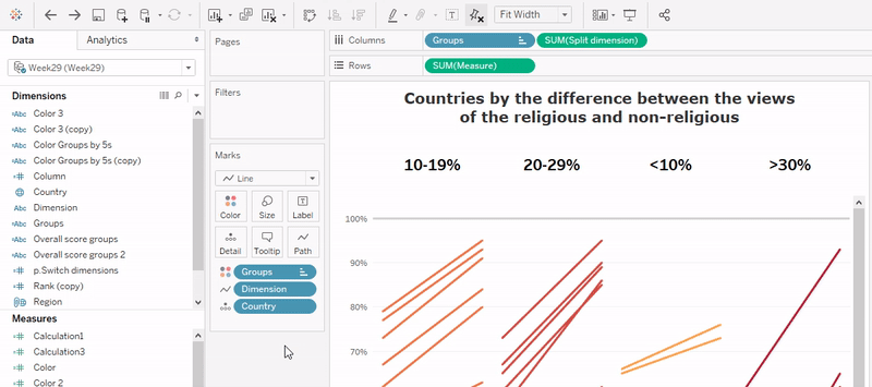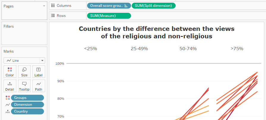 Build the view by placing your ‘Groups’ calculation on columns, then your ‘Split dimension’ calculation next to it. Place ‘Measure’ on rows. Set the marks to Line, put ‘Dimension’ on Path, and ‘Country’ on Detail.