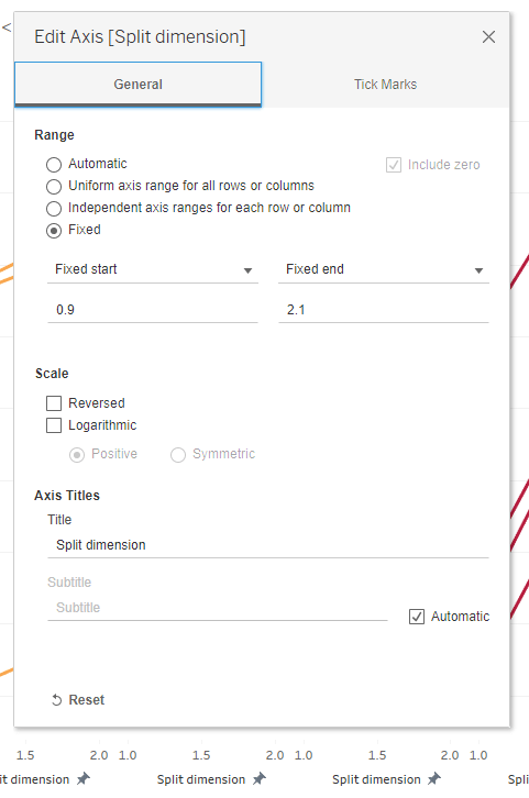 Now we just need to play with the axis and formatting to get the look we want. Fix the ‘Split dimension’ axis, and then hide the header.