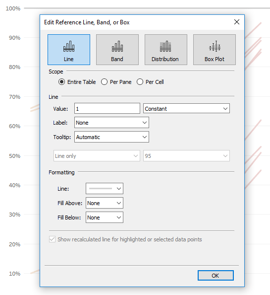 Lastly, (and optionally), I added two reference lines, one at 100% and one at 0%, to indicate the minimum and maximum values since this measure was out of 100%.