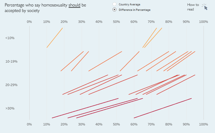 We can also now more easily compare lines of similar slopes. Lebanon (the lowest line) has a similar slope to Brazil and Mexico (the lowest two in Central and South America), yet the overall acceptance rate is much lower in Lebanon. Perhaps the differences in culture, rather than religion, explain the views held in these countries.