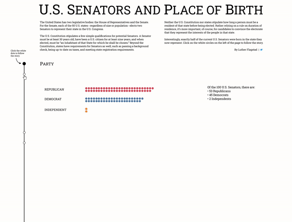 (The topic of Senators and place of birth is a bit of a soft one, but the point here is to show the concept of scrollytelling and not the topic. For you, the reader, I really look forward to what ideas are sparked in your mind and the scrollytelling creations you make.)