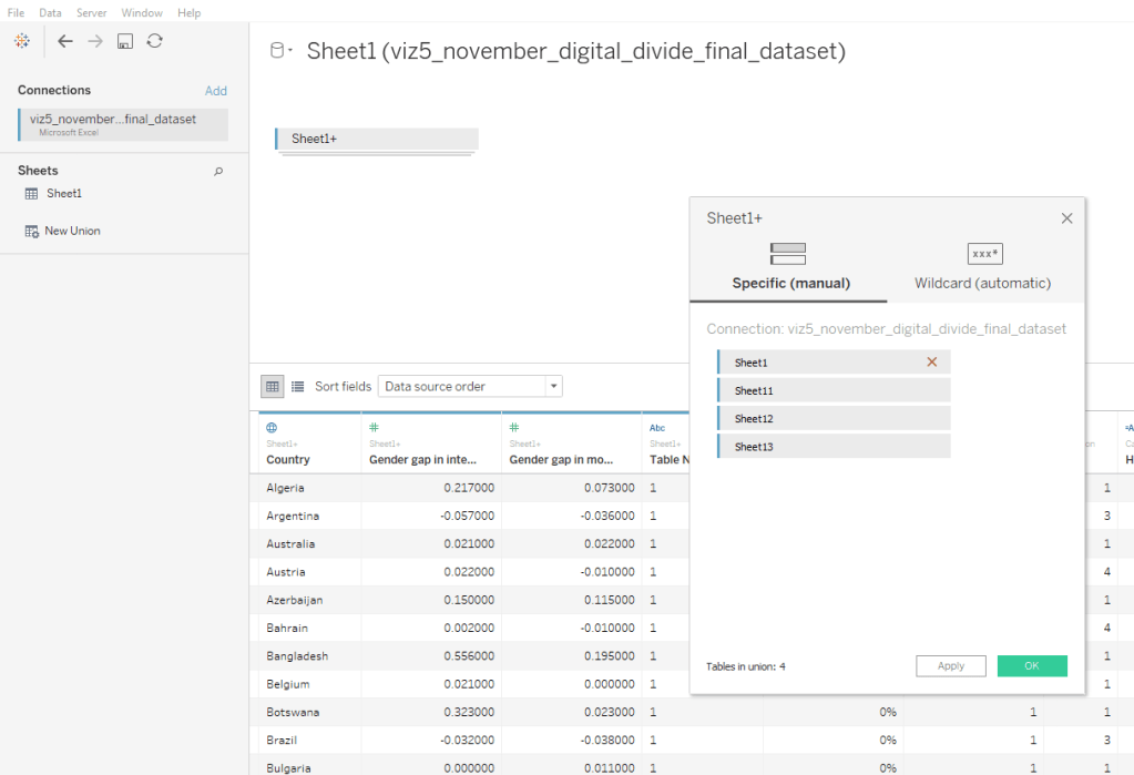Basically, polygons require a data set where a single dimension is associated with as many points as there are in the polygon shape. So, for a rectangle, that means a single data point will need four members of the same dimension in a data set to be drawn in Tableau. This is easily achieved by unioning your data three times (so that there are four sets of the same data). When you union your data, Tableau automatically creates a dimension called “Table Name” with members for each of the data sets in the union. The following union was made by dragging Sheet1 onto the data area four times. (Tableau named these Sheet1-1, 1-2, and 1-3, but without the dash. This is why it looks like 11, 12, and 13.)