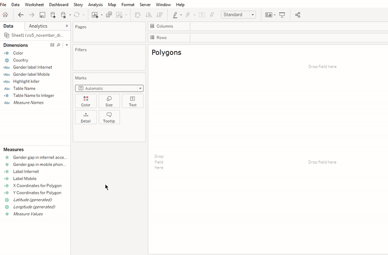 Polygons in themselves can offer an alternative to a scatterplot. I won’t cover polygons in extensive detail, as there are numerous resources for how to create the kinds of shapes you want for your use case, but I will point out one resource that covers square (or rectangle) polygons and will be helpful to us for creating the scatterplot/polygon chart. The post in mention is “Yes Polygons” by Ken Flerlage. Here he covers the four-quadrant polygon chart (as well as how to build such charts without polygons–or “No Polygons”–if you will.)